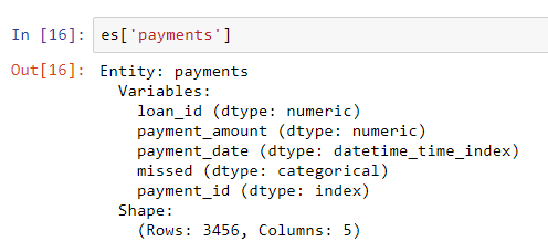 loans 数据框也有唯一索引 loan_id,将其加入实体集的语法和处理 clients 的语法相同。然而,payments 数据框中没有唯一的索引。若我们想把这个实体加入实体集,则需要让 make_index = True,并指定一个索引名。虽然特征工具可以自动推断实体中每一列的数据类型,但我们也可以通过把数据类型字典传入参数 variable_types 来将其覆盖。