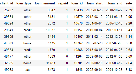 loans:客户名下的贷款。每笔贷款只对应表中的一行数据,但每位客户名下可能有多笔贷款。