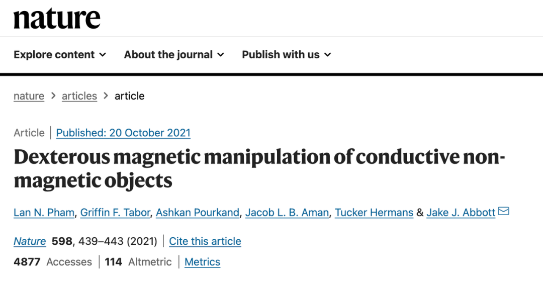 相关研究论文以“Dexterous magnetic manipulation of conductive non-magnetic objects”为题,已发表在权威期刊 Nature 上。