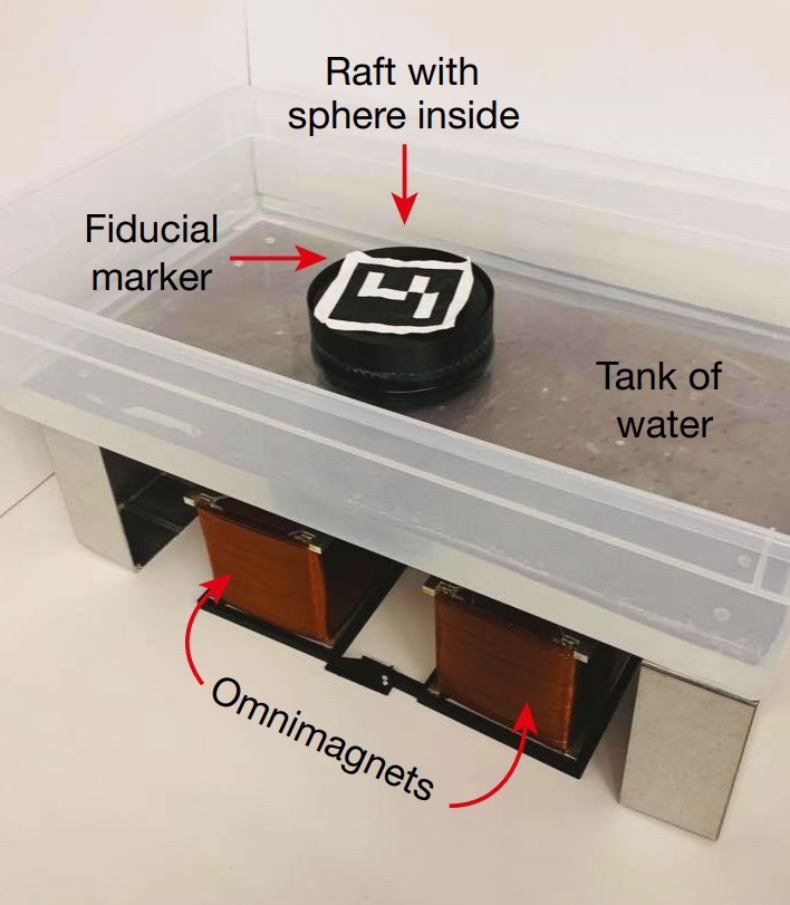 研究人员为了测试该项技术,使用了一系列磁铁来移动水箱中塑料筏子上的铜球(这是模拟微重力下缓慢移动物体的最好方法)。磁铁不仅使球体呈方形移动,而且还使球体旋转。