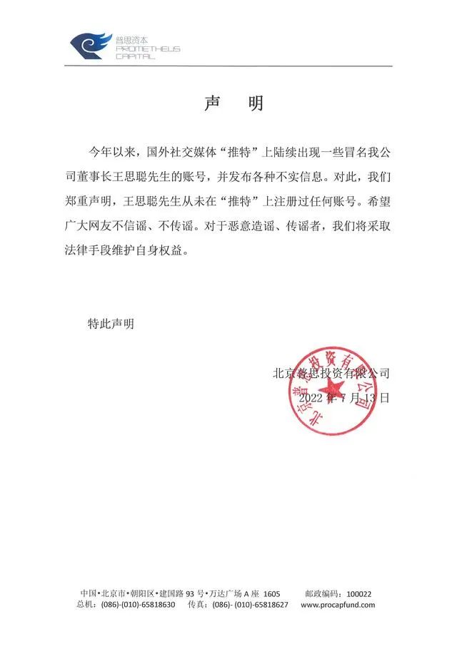 【普思资本:王思聪未在“推特”上注册过任何账号】