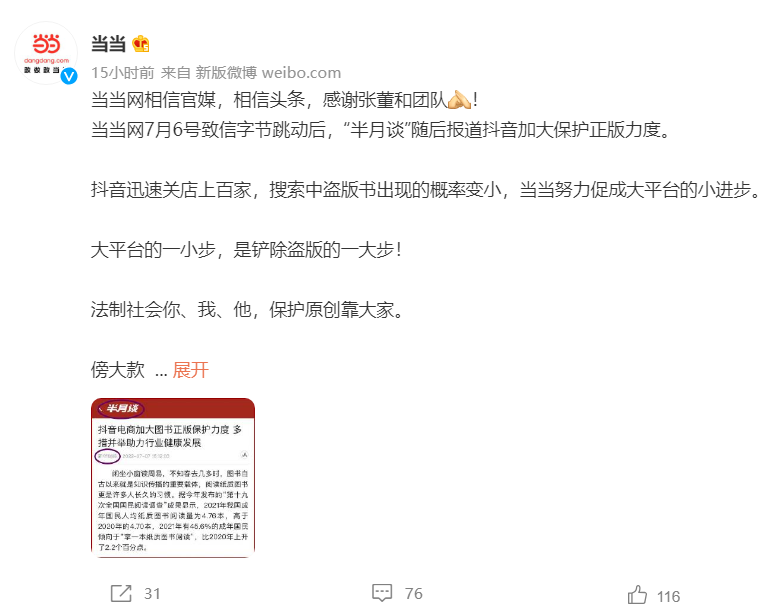 当当发文称,“相信头条,感谢张董和团队”。当当表示,6日致信字节跳动,“头条追逐流量的导向,成了盗版书商的魔指。”随后抖音加大了保护正版力度,迅速关店上百家,搜索中盗版书出现的概率变小。(济南时报)