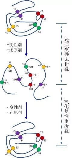 ►图1 Anfinsen 核糖核酸酶变性与自复性的实验示意图