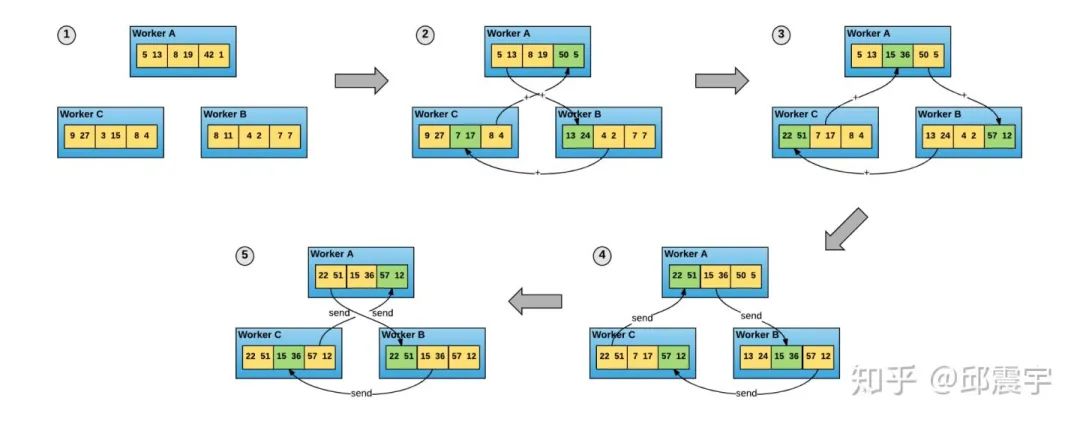 它主要实现原则是每个worker节点只会与它的左节点和右节点进行通信,其中每个节点上会先开辟一个buffer存储要通信的数据,每次通信传输的都是buffer中的某块数据。假设一共有N个节点,那儿每个节点会与它的左右邻居节点通信2*(N-1)次。在第一轮的N-1次通信时,每个节点会把接收到的数据库与对应index上的数据快进行相加(图上1-3),这个阶段一般叫scatter-reduce;在第二轮的N-1次通信时,每个节点会将收到的数据块直接替换掉对应index的数据块(图上4-5),这个阶段一般叫allgather,最后所有 worker节点都会得到完整的融合后的数据。