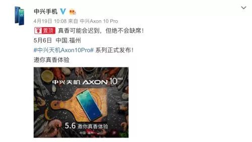 4月19日,中兴手机官方微博披露,中兴天机Axon10 Pro系列将于5月6日在福州正式发布。