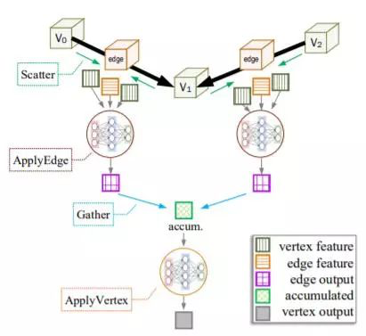表示为顶点程序,其每一层都具有定义好的(结果分发、应用边、信息收集、应用顶点)图操作阶段。该模型不仅可以直观地表示 GNN,而且便于