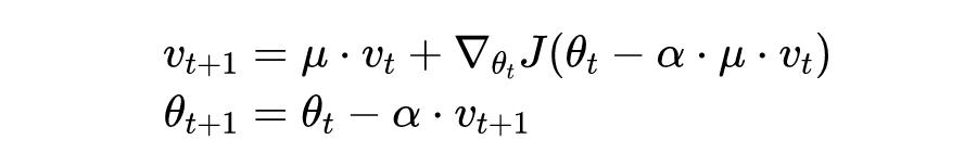 NAG 是在标准梯度下降法中引入一些轻微的改变,它可以加快训练过程并显着提高收敛性。NAG 可以看作是一种改进的动量方法,其可以表示为: