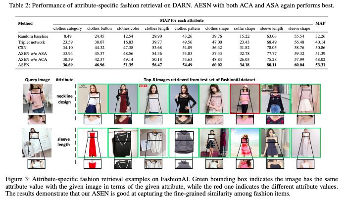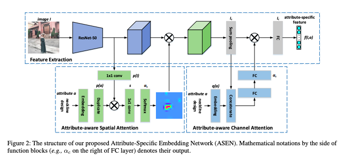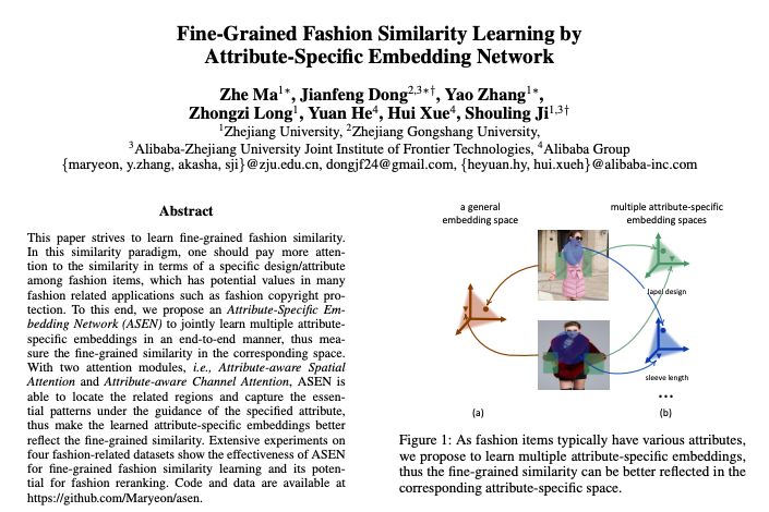 细粒度服饰相似度度量可以用于服饰相关的应用,例如服饰版权保护。这篇论文提出了名为ASEN的特定属性嵌入网络,来端到端联合学习多个指定属性嵌入,因此在相关空间能度量细粒度相似度。在使用基于属性的空间注意力与基于属性的通道注意力模块后,ASEN能定位到相关区域,并在特定属性的指引下捕获必要的模式,因此使得习得的属性特定嵌入信息能更好地表示细粒度相似度。这篇论文被AAAI 2020接收,作者也放出了数据和代码。