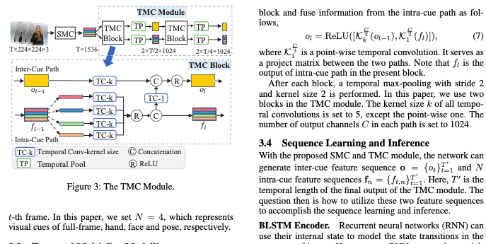 以往的深度学习模型在连续手语识别任务中只关注了最具区分性的特征,而忽略了其他视觉线索,例如手型、面部表情和身体姿势。这篇论文将多线索学习和神经网络相结合,提出了一个名为STMC的时空多线索网络来解决这个问题。STMC网络由空间多线索(SMC)模块和时间多线索(TMC)模块组成,其中SMC模块用于空间表示,并借助一个独立的姿势估计模块来分解不同线索的视觉特征,TMC模块沿两个平行路径对时间相关性进行建模。这篇论文还提出了一个联合优化策略来实现STMC的端到端学习。在三个大型CSLR基准上的实验结果表明这篇论文所提出的方法取得了最好的性能表现。