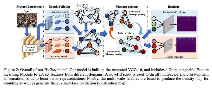 这篇论文提出了一个新的混合图神经网络(HyGnn)模型,通过将人群密度的多尺度特征及其辅助任务交织在一起。HyGnn集成了一个混合图,以将不同比例的特定于任务的特征图表示为节点,以及两种类型的关系作为边。这两种关系分别为:1、多尺度关系,用于捕获跨尺度的特征依赖关系;2、互利关系,为计数和本地化之间的合作搭建桥梁。通过消息传递,HyGnn可以提取节点之间的丰富关系以获得更强大的表示特征,从而获得可靠而准确的结果。HyGnn在ShanghaiTech Part A、ShanghaiTech Part B、UCF_CC_50和UCF_QNRF这四个具有挑战性的数据集上表现出色,超过了目前的最新方法。