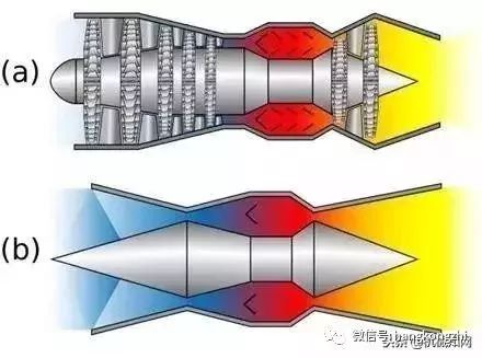 ▲(a)涡喷发动机(b)冲压发动机,可以看到冲压发动机省去了一系列的压气机和涡轮结构,变得更加轻巧,但只有高速下可以正常运转。