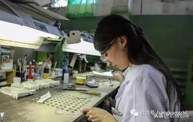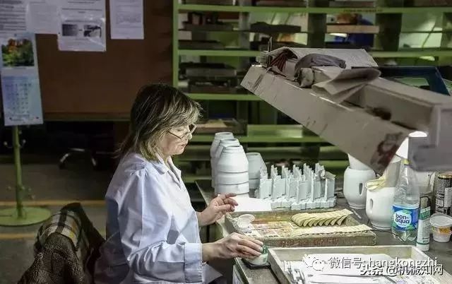 工人正在将塑形后的瓷土模型逐个检查修形,这些做好的瓷土模型将首先烧结成熔融石英陶瓷芯。