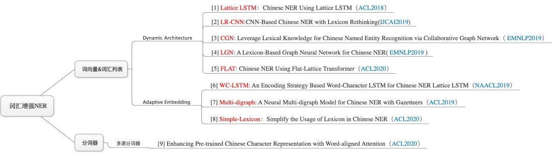 如何在中文NER模型中引入词汇信息,是近年来中文NER的一个研究重点。下图展示了各大顶会中词汇增强NER的主要进展: