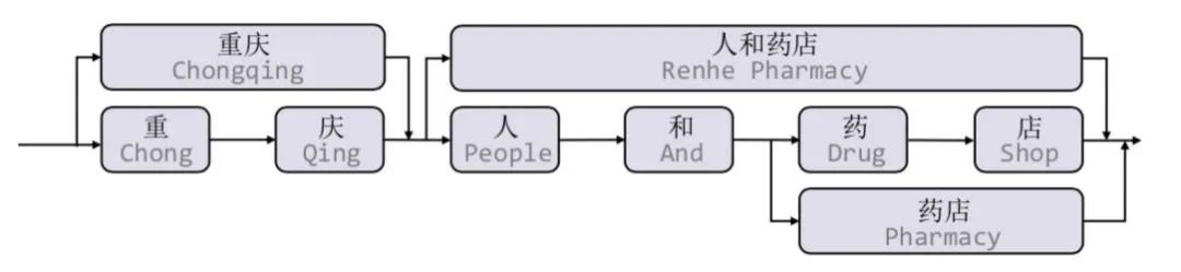 要想更系统的理解FLAT,就必须掌握Lattice LSTM[3]这篇论文,这是针对中文NER任务引入词汇信息的开篇之作。文中提出了一种Lattice LSTM用于融合词汇信息。如下图所示,当我们通过词汇信息(词典)匹配一个句子时,可以获得一个类似Lattice的结构。