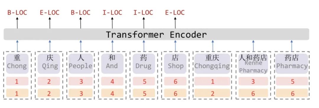 也正是如此,FLAT可以直接建模字符与所有匹配的词汇信息间的交互,例如,字符[药]可以匹配词汇[人和药店]和[药店]。
