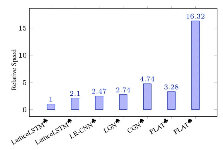 如上图所示,在推断速度方面,FLAT论文也与其他方法进行了对比,FLAT仅仅采用1层Transformer,在指标领先的同时、推断速度也明显优于其他方法。