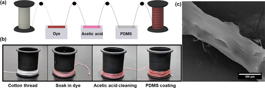 研究人员通过三个步骤的处理将染料“捕捉”到线中。首先,这种线被浸入染料中,然后用乙酸处理,使表面变粗糙并使纤维膨胀,这样会使染料与线之间产生更多的相互结合作用。最后,线会通过聚二甲硅氧烷(PDMS)处理,围绕着线和染料创造出一层柔性的物理密封,它也可防水以及防止染料在清洗期间被过滤掉。重要的是,PDMS 也是透气的,使得分析物可以接触到光学染料。