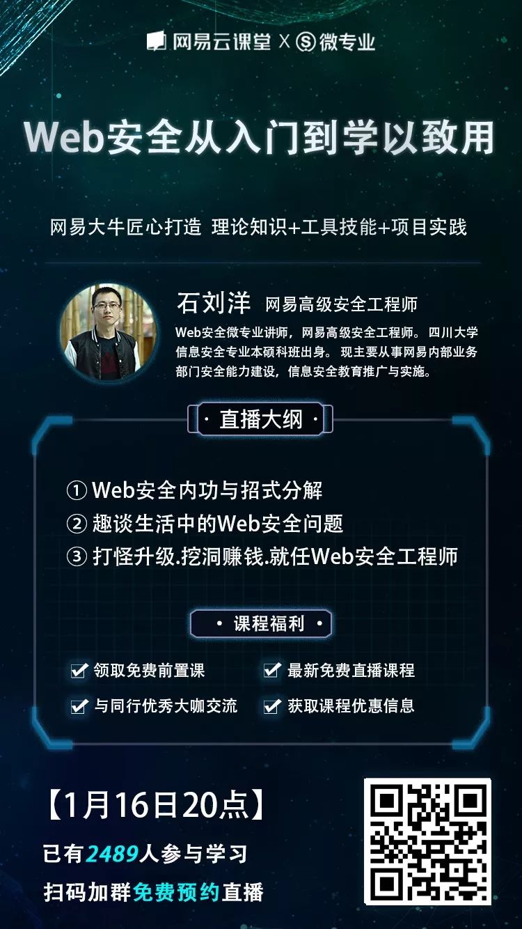为了让大家更进一步了解Web安全的学习路径以及企业对安全人才的实际需求,1月16日晚上20点,我们邀请到网易高级安全工程师石刘洋在网易云课堂进行一场主题为《Web安全从入门到学以致用》的免费的直播分享。