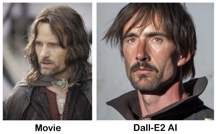 在 DALL·E 2 的众多试用者中,一位名叫 Jim Clyde Monge 的博主独树一帜。他热衷于用 DALL·E 2 生成经典奇幻小说中的各个人物,比如《哈利 · 波特》、《指环王》,生成的人物有些和电影人物接近(比如《指环王》中的阿拉贡),有些则相去甚远(比如《哈利 · 波特》中的赫敏)。