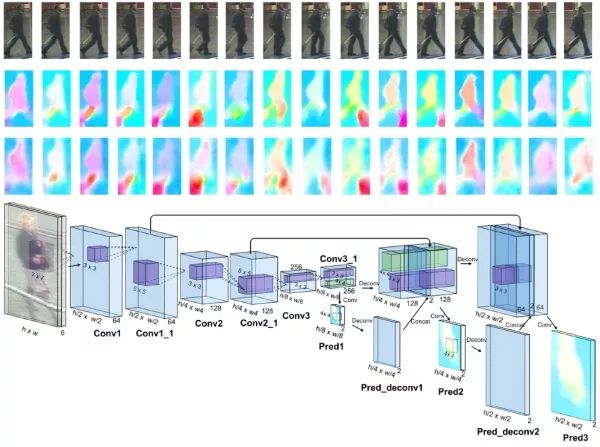 视频序列类的代表方法之一是累计运动背景网络(Accumulative motion context network, AMOC)[23]。AMOC输入的包括原始的图像序列和提取的光流序列。通常提取光流信息需要用到传统的光流提取算法,但是这些算法计算耗时,并且无法与深度学习网络兼容。为了能够得到一个自动提取光流的网络,作者首先训练了一个运动信息网络(Motion network, Moti Nets)。这个运动网络输入为原始的图像序列,标签为传统方法提取的光流序列。如下图所示,原始的图像序列显示在第一排,提取的光流序列显示在第二排。网络有三个光流预测的输出,分别为Pred1,Pred2,Pred3,这三个输出能够预测三个不同尺度的光流图。最后网络融合了三个尺度上的光流预测输出来得到最终光流图,预测的光流序列在第三排显示。通过最小化预测光流图和提取光流图的误差,网络能够提取出较准确的运动特征。