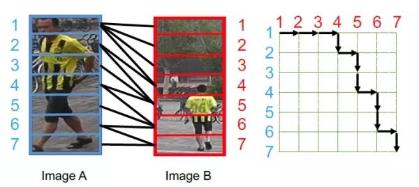 (5)以上所有的局部特征对齐方法都需要一个额外的骨架关键点或者姿态估计的模型。而训练一个可以达到实用程度的模型需要收集足够多的训练数据,这个代价是非常大的。为了解决以上问题,AlignedReID[16]提出基于SP距离的自动对齐模型,在不需要额外信息的情况下来自动对齐局部特征。而采用的方法就是动态对齐算法,或者也叫最短路径距离。这个最短距离就是自动计算出的local distance。