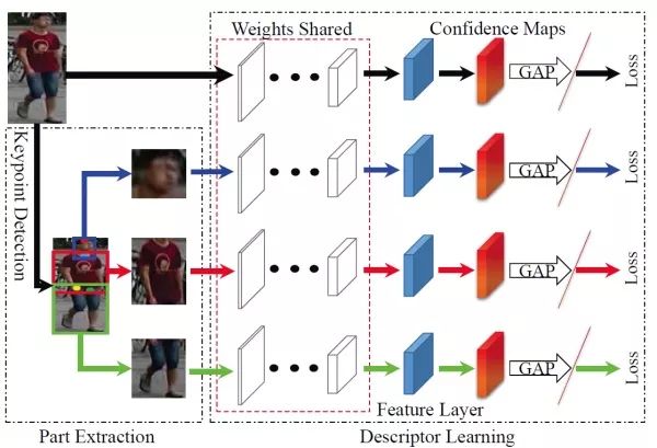 (4)论文[15]提出了一种全局-局部对齐特征描述子(Global-Local-Alignment Descriptor, GLAD),来解决行人姿态变化的问题。与Spindle Net类似,GLAD利用提取的人体关键点把图片分为头部、上身和下身三个部分。之后将整图和三个局部图片一起输入到一个参数共享CNN网络中,最后提取的特征融合了全局和局部的特征。为了适应不同分辨率大小的图片输入,网络利用全局平均池化(Global average pooling, GAP)来提取各自的特征。和Spindle Net略微不同的是四个输入图片各自计算对应的损失,而不是融合为一个特征计算一个总的损失。