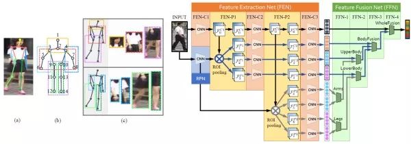(3)CVPR2017的工作Spindle Net[14]也利用了14个人体关键点来提取局部特征。和论文[12]不同的是,Spindle Net并没有用仿射变换来对齐局部图像区域,而是直接利用这些关键点来抠出感兴趣区域(Region of interest, ROI)。Spindle Net网络如下图所示,首先通过骨架关键点提取的网络提取14个人体关键点,之后利用这些关键点提取7个人体结构ROI。网络中所有提取特征的CNN(橙色表示)参数都是共享的,这个CNN分成了线性的三个子网络FEN-C1、FEN-C2、FEN-C3。对于输入的一张行人图片,有一个预训练好的骨架关键点提取CNN(蓝色表示)来获得14个人体关键点,从而得到7个ROI区域,其中包括三个大区域(头、上身、下身)和四个四肢小区域。这7个ROI区域和原始图片进入同一个CNN网络提取特征。原始图片经过完整的CNN得到一个全局特征。三个大区域经过FEN-C2和FEN-C3子网络得到三个局部特征。四个四肢区域经过FEN-C3子网络得到四个局部特征。之后这8个特征按照图示的方式在不同的尺度进行联结,最终得到一个融合全局特征和多个尺度局部特征的行人重识别特征。
