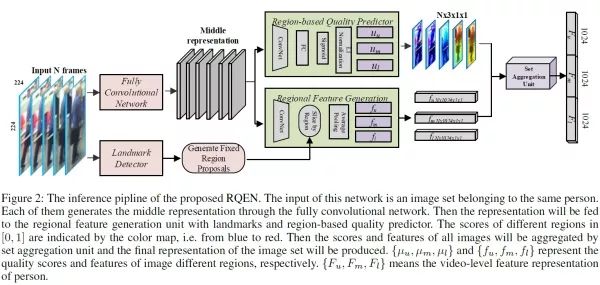 如上图,文章认为在遮挡较严重的情况下,如果用一般的pooling会造成attention map变差,遮挡区域的特征会丢失很多。而利用论文的方法每帧进行一个质量判断,就可以着重考虑那些比较完整的几帧,使得attention map比较完整。而关键的实现就是利用一个pose estimation的网络,论文叫做landmark detector。当landmark不完整的时候就证明存在遮挡,则图片质量就会变差。之后pose feature map和global feature map都同时输入到网络,让网络对每帧进行一个权重判断,给高质量帧打上高权重,然后对feature map进行一个线性叠加。思路比较简单但是还是比较让人信服的。