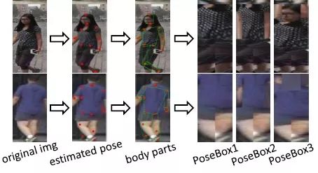(2)为了解决图像不对齐情况下手动图像切片失效的问题,一些论文利用一些先验知识先将行人进行对齐,这些先验知识主要是预训练的人体姿态(Pose)和骨架关键点(Skeleton) 模型。论文[13]先用姿态估计的模型估计出行人的关键点,然后用仿射变换使得相同的关键点对齐。如下图所示,一个行人通常被分为14个关键点,这14个关键点把人体结果分为若干个区域。为了提取不同尺度上的局部特征,作者设定了三个不同的PoseBox组合。之后这三个PoseBox矫正后的图片和原始为矫正的图片一起送到网络里去提取特征,这个特征包含了全局信息和局部信息。特别提出,这个仿射变换可以在进入网络之前的预处理中进行,也可以在输入到网络后进行。如果是后者的话需要需要对仿射变换做一个改进,因为传统的仿射变化是不可导的。为了使得网络可以训练,需要引入可导的近似放射变化,在本文中不赘述相关知识。