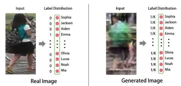 论文[26]是上一篇论文的加强版,来自同一个课题组。前一篇的GAN造图还是随机的,在这一篇中变成了可以控制的生成图。ReID有个问题就是不同的摄像头存在着bias,这个bias可能来自光线、角度等各个因素。为了克服这个问题,论文使用GAN将一个摄像头的图片transfer到另外一个摄像头。在GAN方面依然还是比较正常的应用,和前作不同的是这篇论文生成的图是可以控制,也就是说ID是明确的。于是标签平滑也做了改进,公式如下: