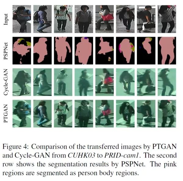 除了摄像头的bias,ReID还有个问题就是数据集存在bias,这个bias很大一部分原因就是环境造成的。为了克服这个bias,论文[27]使用GAN把一个数据集的行人迁移到另外一个数据集。为了实现这个迁移,GAN的loss稍微设计了一下,一个是前景的绝对误差loss,一个是正常的判别器loss。判别器loss是用来判断生成的图属于哪个域,前景的loss是为了保证行人前景尽可能逼真不变。这个前景mask使用PSPnet来得到的,效果如下图。论文的另外一个贡献就是提出了一个MSMT17数据集,是个挺大的数据集,希望能够早日public出来。