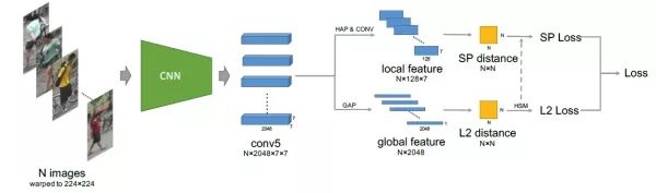 这个local distance可以和任何global distance的方法结合起来,论文[15]选择以TriHard loss作为baseline实验,最后整个网络的结构如下图所示,具体细节可以去看原论文。