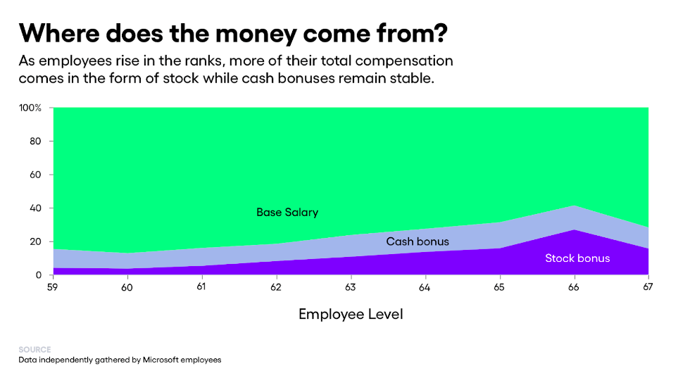 并且随着员工晋升到更高的级别,他们的薪酬更多地以股票的形式发放。在第 66 级,微软员工报告说,近 40% 的薪酬是现金奖励和股票奖励。众包数据显示,虽然在微软员工的职业生涯中,现金奖励占工资的比例相对稳定,但股票薪酬在更高职级上可升至年收入的近 20%。