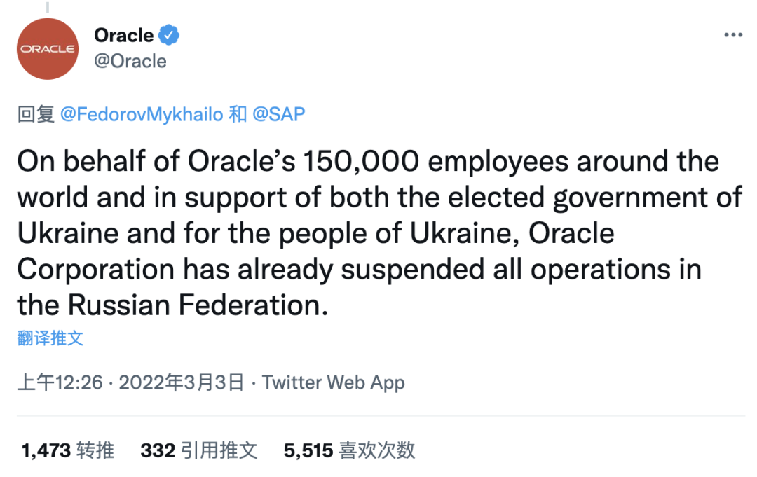 3 月 3 日,Oracle 官方发了一则 Twitter 宣布,「代表甲骨文公司在世界各地的 15 万名员工,甲骨文公司已经暂停了在俄罗斯联邦的所有业务。」据悉,这条推文是在乌克兰数字转型部部长 Mykhailo Fedorov 发布的一条呼吁 50 家科技公司对俄罗斯采取行动的推文后三个小时发布的。