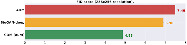 ImageNet 分类准确率在 256x256 分辨率下的得分,用以衡量利用生成数据训练的分类器的验证集准确率。与现有的方法相比,使用 CDM 生成的数据取得了明显的进步,缩小了真实数据和生成数据之间的分类准确率的差距(数值越高越好)