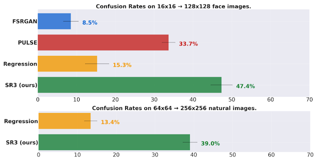 上:我们在 16x16→128x128 的人脸任务中实现了接近 50% 的混淆率,优于一流的人脸超分辨率方法 PULSE 和 FSRGAN。下:在 64x64 → 256x256 的自然图像这个更困难的任务中,我们也达到了 40% 的混淆率,表现水准远超回归基线