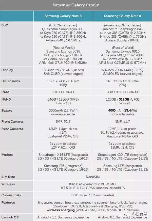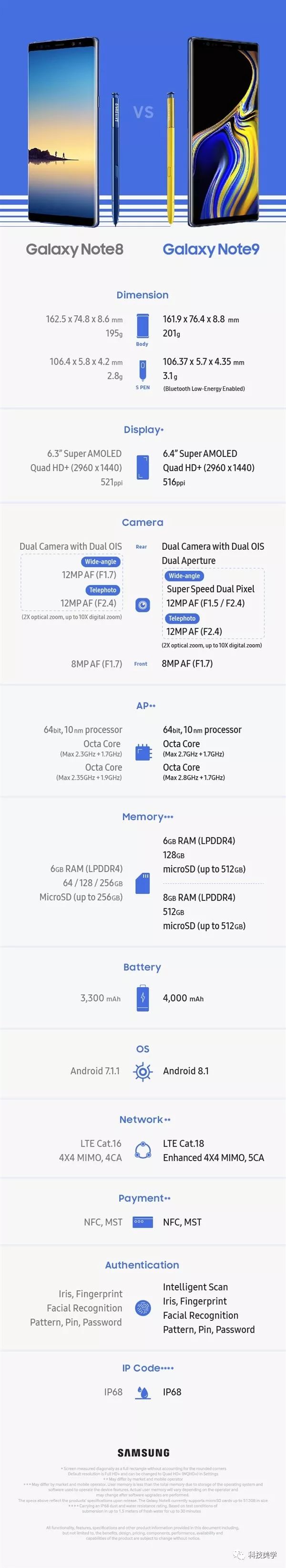 三星也按照惯例制作了一份信息图解,简单明了地对比了Note 9、Note 8的主要规格。可以看出Note 9的主要变化有: