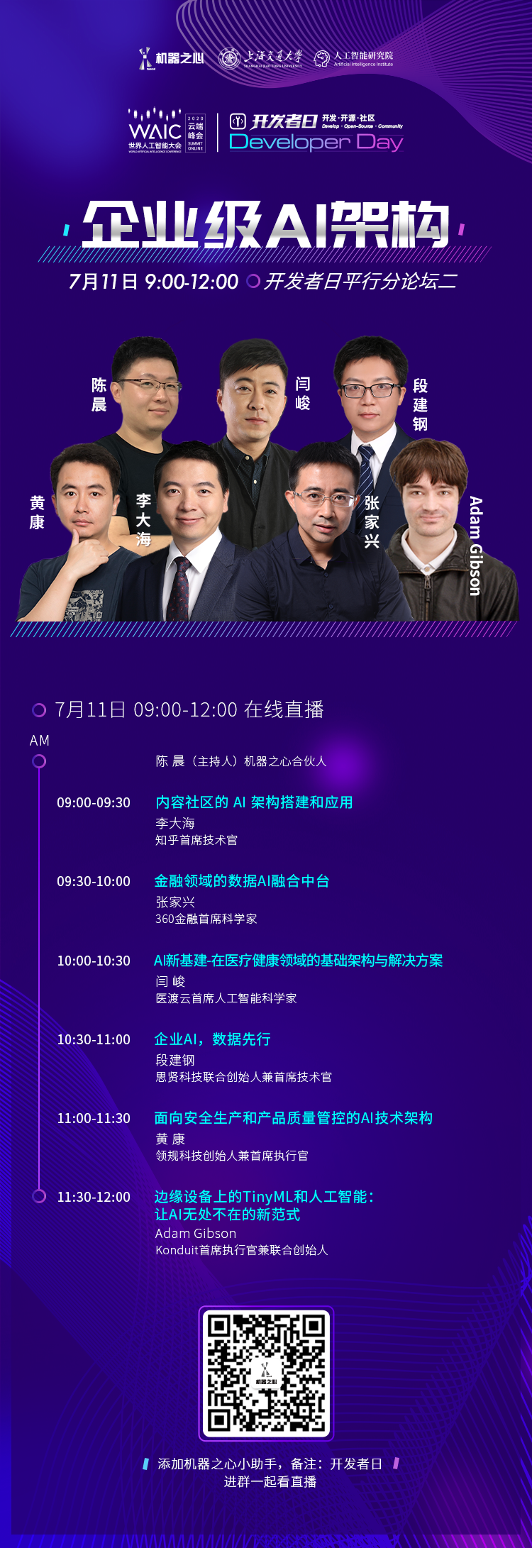 其中,「企业级AI架构」分论坛将于 7月11日9:00-12:00 在线上举行,添加机器之心小助手,备注“开发者日”,进群一起看直播。观看链接将于后续公布。