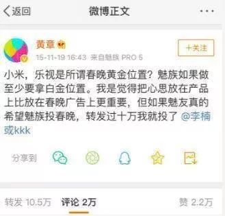 2016 年智能手机厂商竞争非常激烈,在春晚广告招标会中标消息公布后,同为智能手机企业的魅族坐不住了。其创始人黄章在微博上直接喊话小米、乐视,并表示魅族要拿下央视春晚的白金位置,前提是网友转发过 10 万。