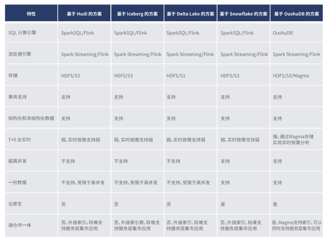 另一类则是从新的基础架构发展出的云原生数据仓库,其中比较典型的代表有 Snowflake、OushuDB 方案,二者均突破了传统 MPP 和 Hadoop 的局限性,实现了存储和计算的完全分离,并且通过虚拟计算集群技术,其单个集群可以达到数万节点,同时在复杂查询性能和 SQL 兼容性上也非常完善。在国外,Snowflake 可以算作落地湖仓一体的成功先例之一,而偶数科技围绕 OushuDB 提出的湖仓一体解决方案,也成为国内该赛道中的一颗耀眼的新星。