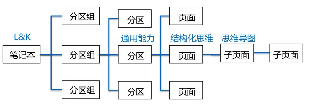 OneNote笔记包括了笔记本、分区组、分区,页和子页,这是一个逐层包容的关系: