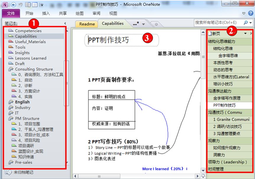 其次,我在“L&K笔记本”中建立了“Competencies(素质)”、“Capabilities(能力)”、“Industry(行业)”等分区,以及“PMStructure(ERP实施框架)”、“ConsultingStructure(咨询框架)”等分区组,清晰地呈现了个人职业及能力框架的总体架构(参见上图左侧①)。