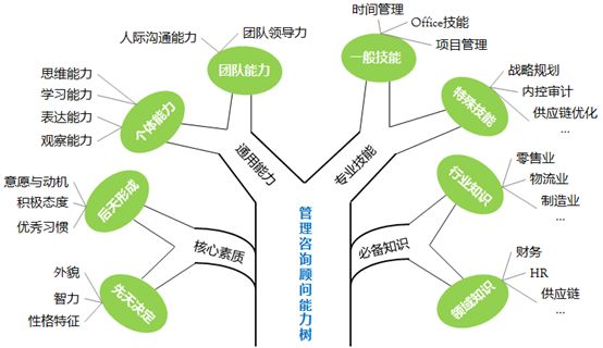 我以管理咨询顾问(这是个相当万金油的行业,80%的职业都可借鉴下这个职业的能力树)为例,演示下画能力树的过程。