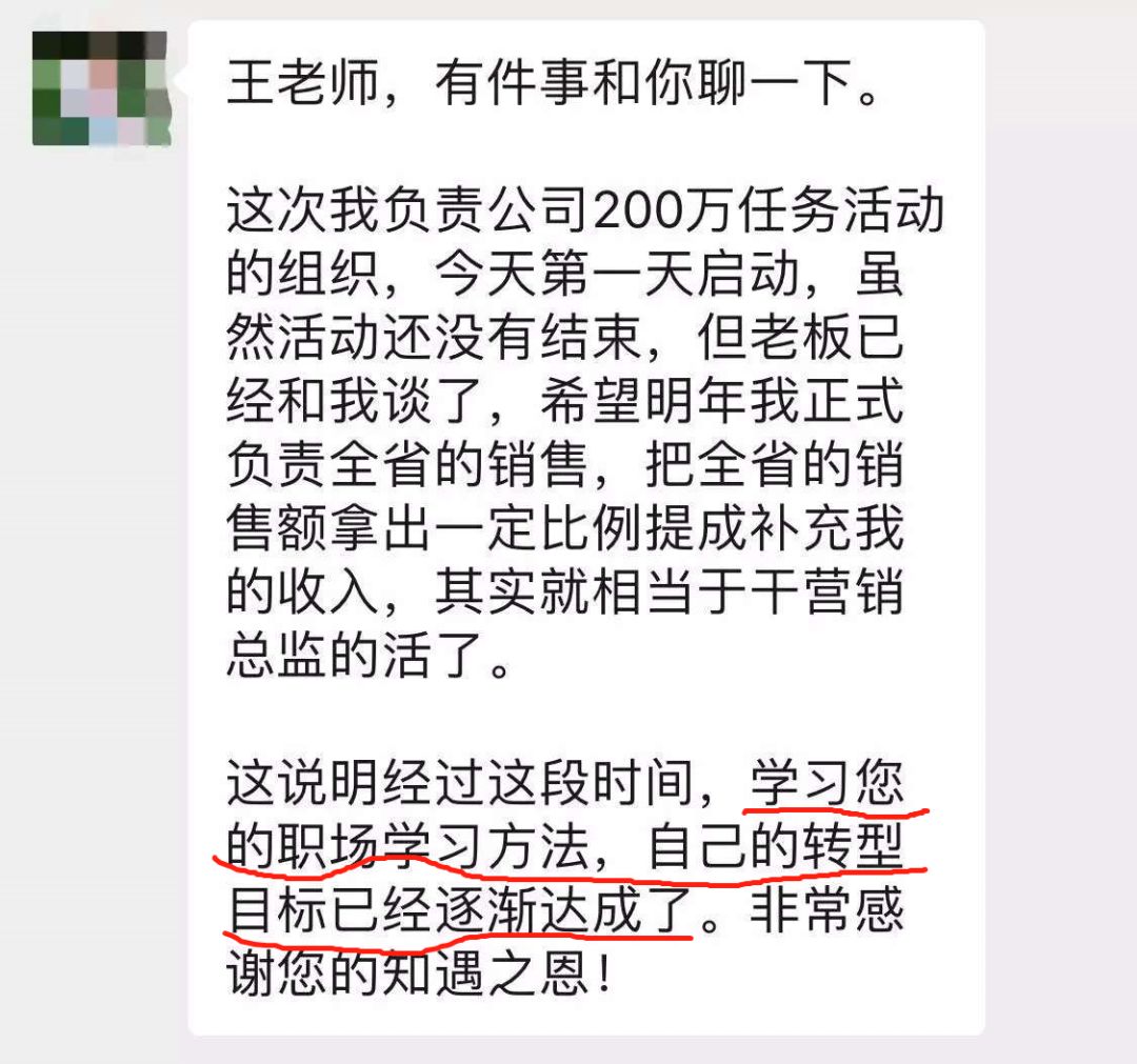 万达的一个高管通过学习课程,升了职后表示:“这个课程是自己的宝贝,自己分享出去就丧失了竞争力。”