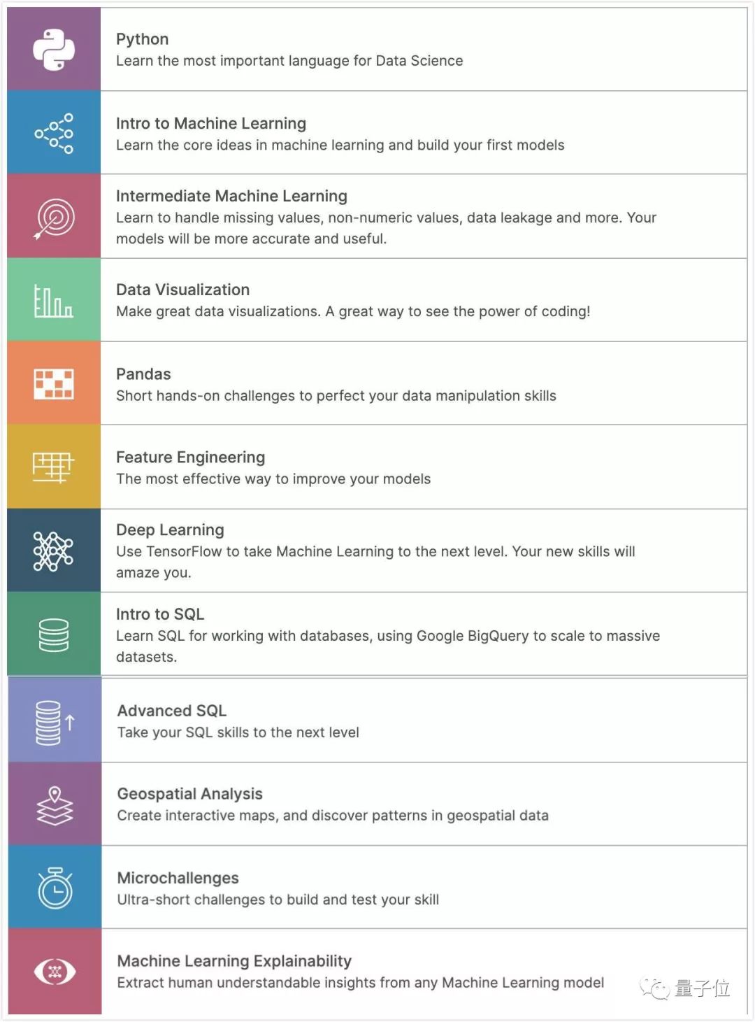 Python,机器学习入门,中极机器学习,数据可视化,Pandas,特征学习,深度学习,SQL入门,SQL进阶,地理空间分析,机器学习可解释性。