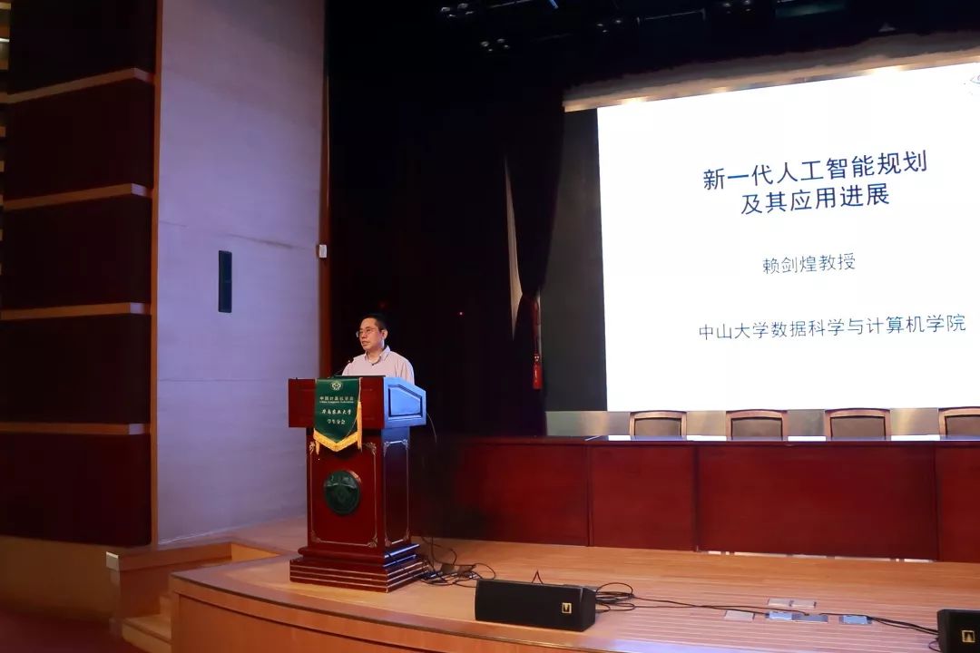 在成立仪式结束之后,CCF华南农业大学学生分会举办了第一次学术报告会。此次学术报告会以人工智能前沿技术为主题,邀请了中山大学数据科学与计算机学院赖剑煌教授、华南理工大学自动化科学与工程学院俞祝良教授作精彩报告。首先,赖剑煌以《新一代人工智能规划及其应用进展》为题,介绍了人工智能技术的发展历程与关键挑战,并结合研究团队近年来的相关研究工作,以自适应深度生长学习、行人再识别、聚类与集成聚类为例向同学们阐述了人工智能领域的若干研究进展。接着,俞祝良以《机器学习技术在脑机交互及脑信号分析中的应用研究》为题,介绍了脑机交互与脑信号分析的研究问题与研究现状,特别阐述了机器学习技术,特别是深度学习技术,在脑机交互与脑源定位上的应用研究工作。