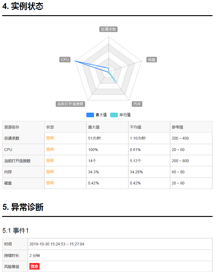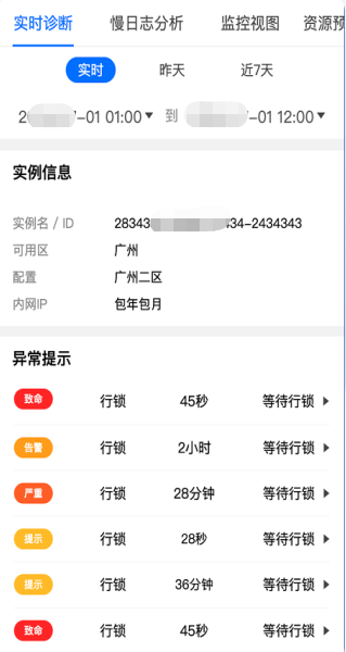 数据库健康状况打分。将数据库的核心监控指标(例如活跃连接数、CPU、内存、磁盘等)纳入到评分模型中,同时也将结合数据库的历史异常率,慢日志、死锁、审计日志等深层次分析找出潜在问题,综合给数据库的健康状况进行打分。