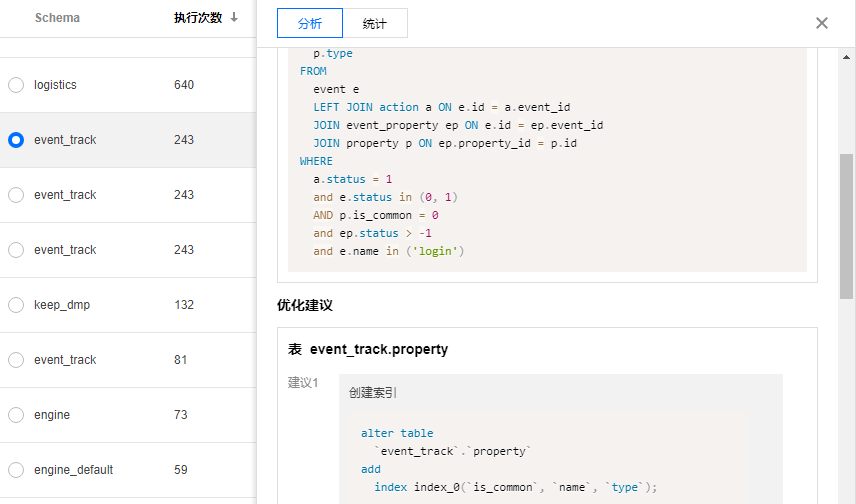 针对聚合后的 SQL 语句,根据其执行计划的结果,综合分析资源消耗、扫描和返回集合大小、索引使用合理性等,对 SQL 的性能进行分析,并针对低质量 SQL 结合索引情况、库表设计,给出优化建议。