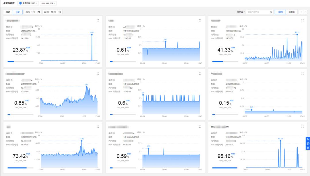 在应对流量洪峰的保障中,传统的监控很难提供一个关注所有数据库实时状态的全局视野。DBbrain 针对这一行业痛点,为用户提供了“全实例监控”、“全实例概览”,实现以全数据库实例维度(用户整体视角)的监控指标展示。统一监控视图里展示所有实例(9 宫格和 36 宫格切换)监控指标的横向视图,便于用户查看和发现数据库异常问题,提高运维效率。
