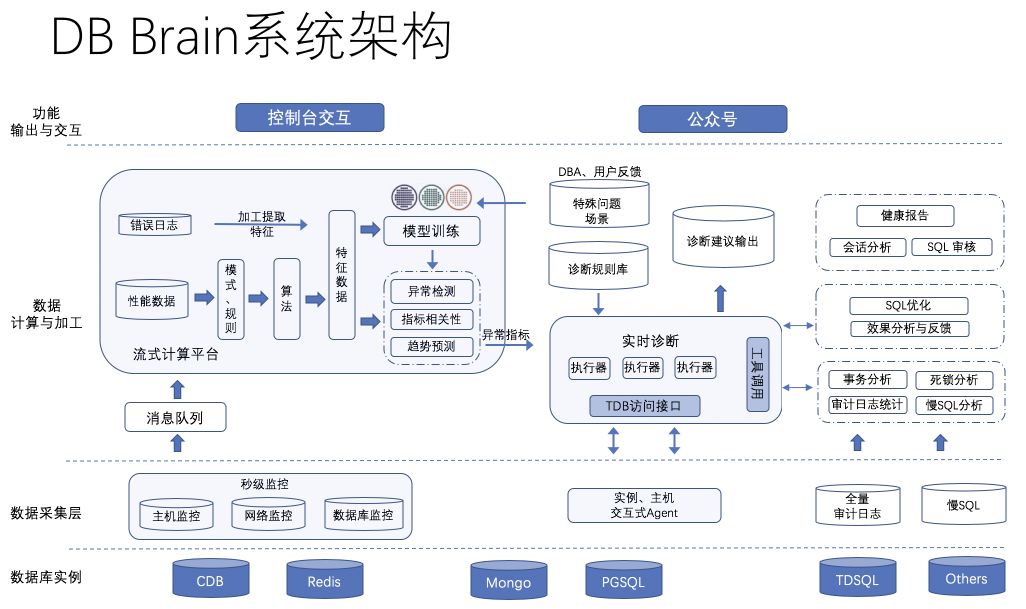 DBbrain 系统架构从下到上依次为数据库实例、数据库采集层、数据计算与加工、功能输出与交互。